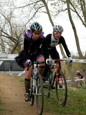 Last year I was waaay too serious to dress up for the Halloween race, in fear that a wardrobe malfunction would tank my chances at the series championship. This year, I have no chances, so I figured I should have fun at least. That I did, but I definitely didn't arrive at the starting line with an ass-kicking mentality. At least I got a little real racing in Saturday since there were collegiate categories in the ICX race, and I got mix it up with Marion's B squad a bit.